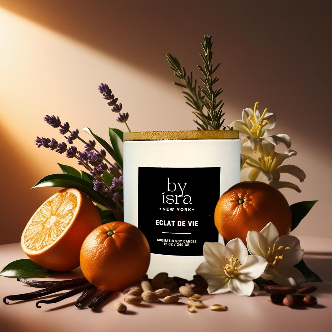 The Éclat De Vie Candle, inspired by our renowned perfume, is a sophisticated addition to our collection, celebrated for its feminine charm and captivating scent. Crafted from pure soy wax, it reflects our commitment to sustainability and quality, offering a clean, enduring burn with a gentle, luminous glow. Blending Mandarin Orange, Bergamot, and Lavender at the top, with a heart of Jasmine Sambac and Orange Blossom, and a base of Vanilla, Tonka Bean, and Cedarwood, this candle creates a refined atmosphere reminiscent of a serene moonlit garden. Perfect for enhancing your space or as a thoughtful gift, Éclat De Vie transforms any room into a sanctuary of beauty and tranquility with its elegant fragrance and natural charm.