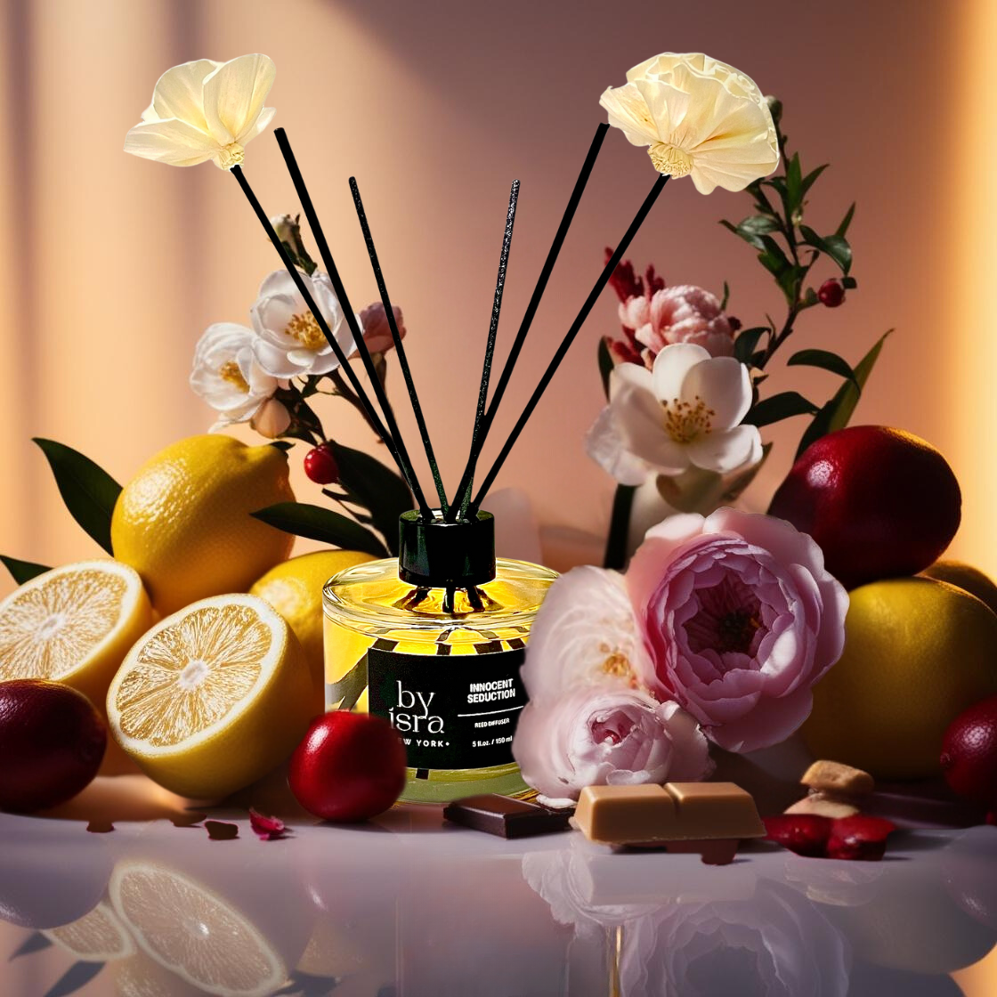 The Innocent Seduction Reed Diffuser is a luxurious addition to our collection, designed to provide a continuous, long-lasting fragrance that enhances any space with elegance and charm. Inspired by our Innocent Seduction perfume, it blends floral and fruity notes, featuring Lemon, Mandarin, Red Fruits, Jasmine, Rose, Peony, Sandalwood, Musk, and Praline. This exquisite combination evokes the allure of a blossoming garden, creating a refined and enchanting atmosphere. Perfect as a personal indulgence or a thoughtful gift, this reed diffuser embodies sophistication and transforms any environment into a sanctuary of lasting luxury.
