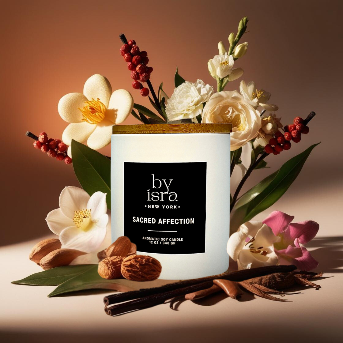 The Sacred Affection Candle is a luxurious addition to our collection, crafted from natural soy wax for a clean, long-lasting burn and a soft, radiant glow. Inspired by our Sacred Affection perfume, it features top notes of Bergamot, Neroli, and Pink Pepper, a heart of Jasmine, Tuberose, Iris, and Orange Blossom, and base notes of Sandalwood, Vanilla, Patchouli, and Vetiver. This harmonious blend creates an atmosphere of warmth and refinement, reminiscent of a blooming garden. Perfect for enhancing your space or as a thoughtful gift, Sacred Affection transforms any room into a sanctuary of beauty and tranquility, offering a sensory experience that elevates every occasion.